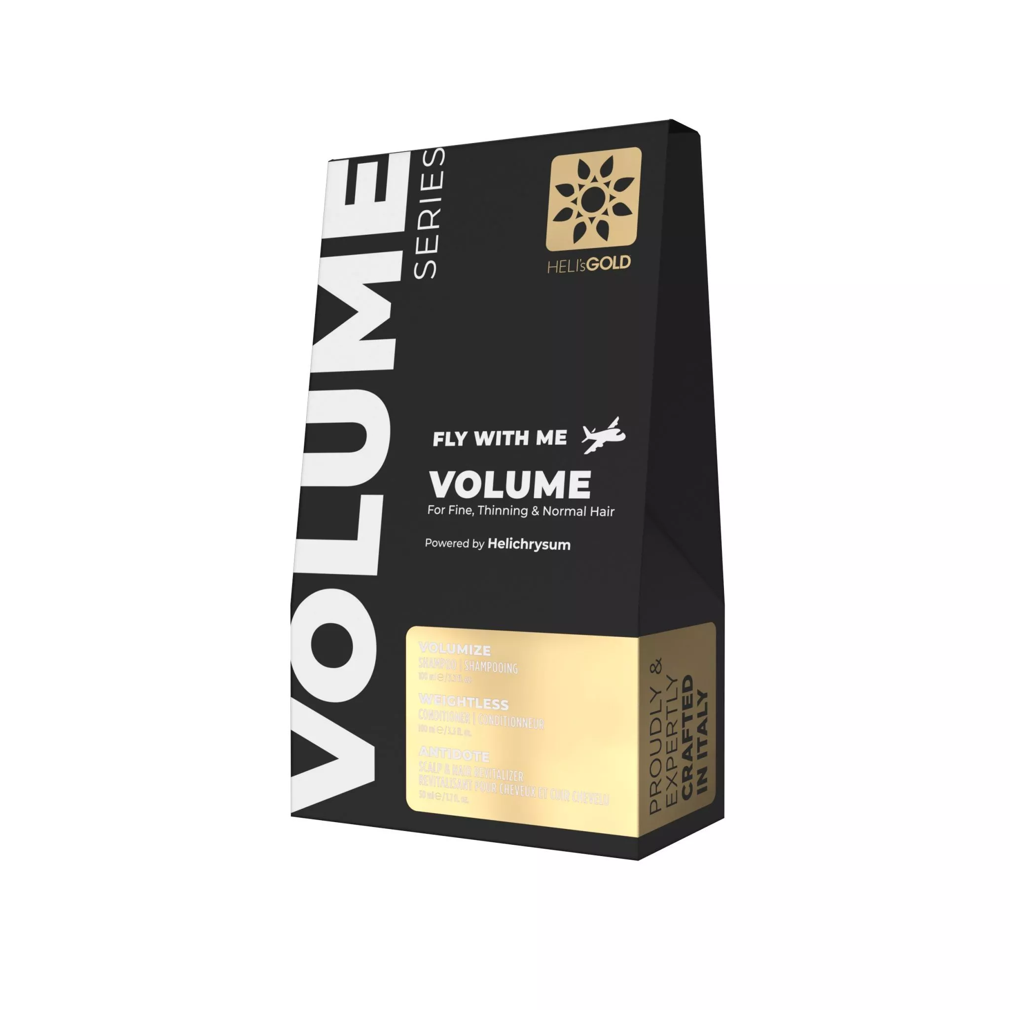 Volume Series Fly With Me Travel Set, kit compus din trei produse din gama Heli’s Gold, care contine tot ce ai nevoie pentru ca parul tau sa arate exceptional oriunde te-ai afla.
